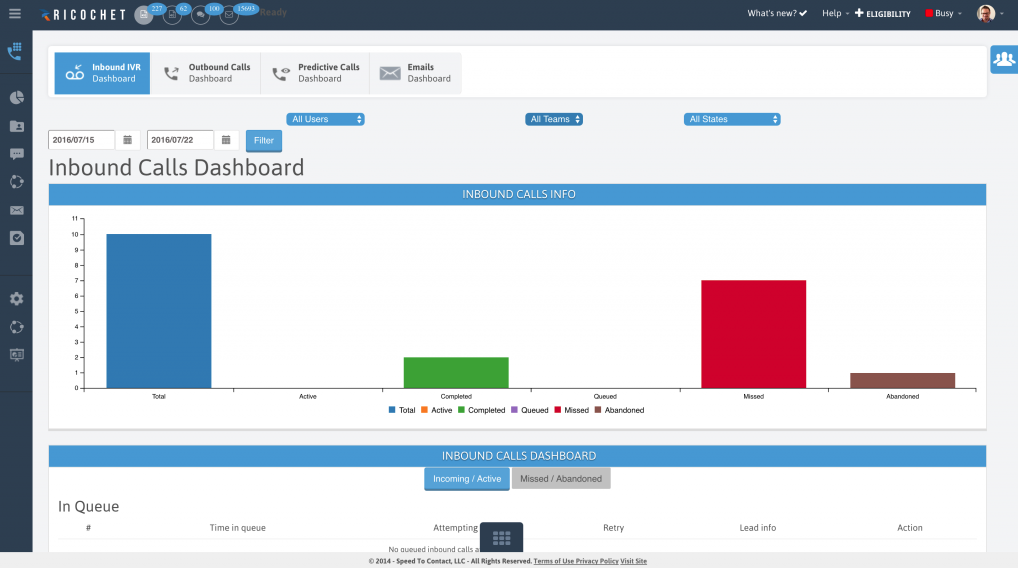 Ricochet360 is an all-in-one dialer, CRM, and marketing automation platform for enterprises call centers, and sales and customer service teams. Ricochet360 enables teams to call leads and close deals much faster; manage all prospects, calls, and emails; route and track inbound phone calls; and streamline time-consuming marketing and sales tasks all from one platform. The solution is also highly customizable to fit a team's specific needs and budget.