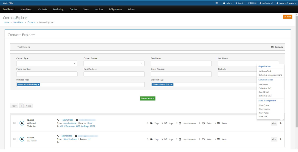 We provide a complete management system with tasks, appointments, sms, email and payment processing to manage your contacts. Non-Profit Memebrship and Membership based Business can see the beneift of recurring contact and charges Quickly organize, manage and track all aspects of your contacts or customers. Intake forms, website forms, quotes management, invoicing, policy and sales tracking, Payments processing using ACH and Credit/Debit Cards, Appointment Reminders Using Sms and Emails. Contact Types Organize contacts, by type and Add Custom Contact Lists and mass email or SMS the list.